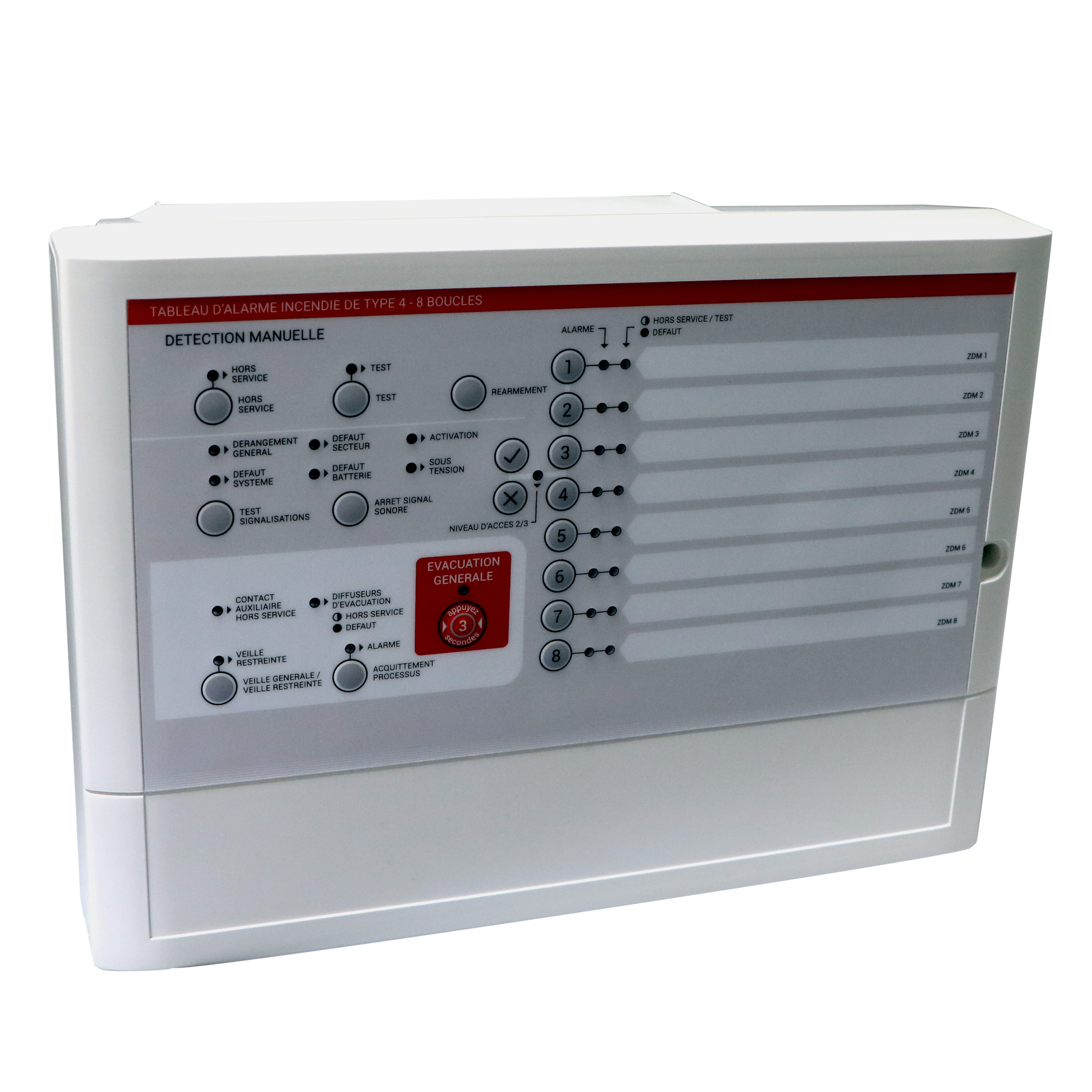 TABLEAU D'ALARME INCENDIE DE TYPE 4 - 3 LIGNES DE DIFFUSEURSD'EVACUATION - 8 BOUCLES DE DETECTION - 4 RELAIS AVEC FONCTIONNEMENT PARAMETRABLE